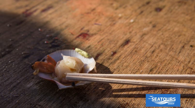 A definite highlight of the tour is the towing of the dredge along the ocean floor, when different kinds of shellfish are scooped up from the bottom of the ocean: scallops, sea urchins, crabs, starfish, sea cucumbers, some of which can be eaten fresh (scallops and sea urchins, for example).